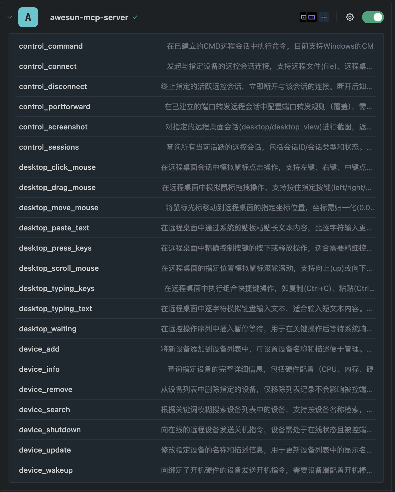 配置完成后我们可以看到向日葵提供了二十多个工具,这是 AI 可用的工具集,见下图: