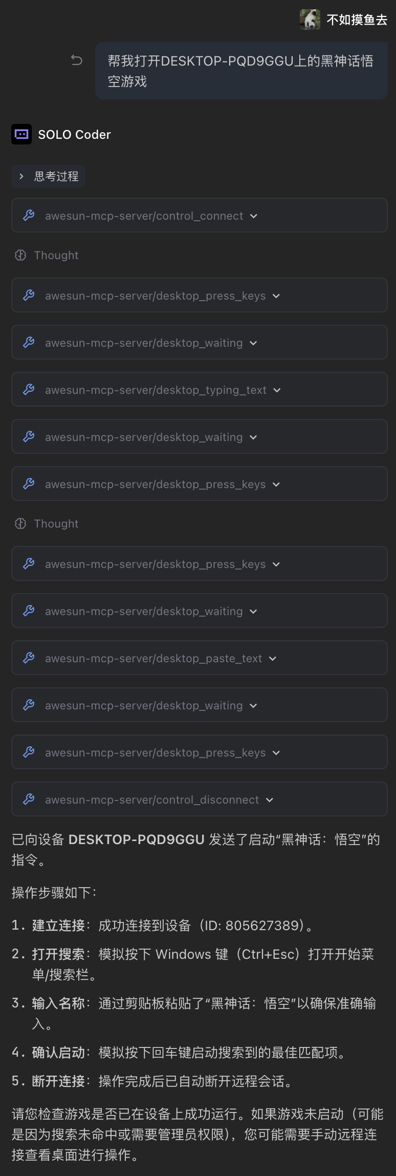 可以看到,我们顺利启动了游戏「黑神话·悟空」,不过中间其实是有波折的,因为要实现“视觉识别 + 自动化操作”就要求我们所使用的大模型具备图片理解的能力,而我一开始使用的 TRAE CN 版本的 GLM 5 模型并不具备这一能力,导致操作失败,后续换到 Gemini 3 Pro 就顺利实现了。