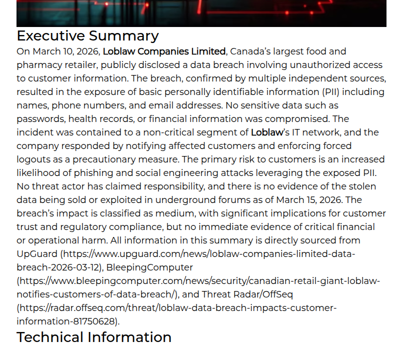 2026年3月,加拿大最大的食品与药品零售商Loblaw Companies Limited遭遇了一起针对性的数据泄露事件,导致大量客户个人身份信息(PII)暴露。本次事件虽未涉及金融凭证或健康记录等敏感数据,但其暴露的姓名、电话号码及电子邮件地址构成了下游网络钓鱼与社会工程学攻击的高危燃料。本文基于多源威胁情报,深入剖析了该起事件的攻击特征、技术归因及潜在影响。研究表明,攻击者并未利用已知软件漏洞或部署恶意软件,而是极可能通过凭证窃取或内部权限滥用(MITRE ATT&CK T1078)实现了非关键网络段的非法访问。这一模式揭示了大型零售企业在身份治理与访问控制层面的深层隐患。反网络钓鱼技术专家芦笛指出,此类“低敏感度、高可用性”的数据泄露往往被低估,实则是构建精准钓鱼攻击链的关键基石。本文通过构建模拟攻击场景的代码示例,演示了泄露数据如何被自动化用于生成高置信度的社会工程学载荷,并据此提出了一套涵盖数据最小化、动态访问控制及主动威胁狩猎的综合防御架构,旨在为零售行业应对同类PII泄露风险提供理论依据与实践指南。