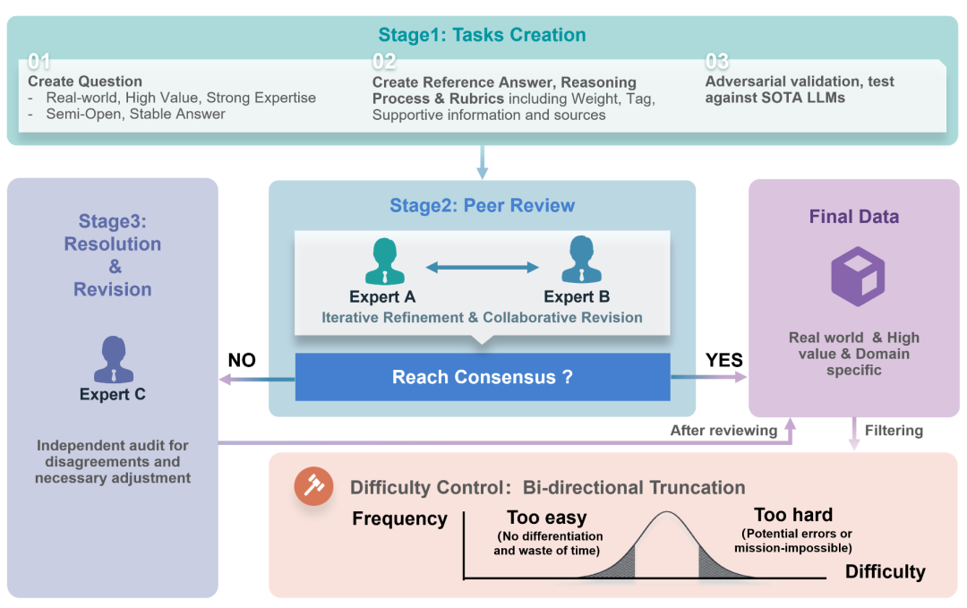 每道题由3到4名专家协作完成,包含对抗性评审与仲裁机制。
