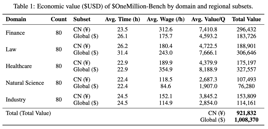 $OneMillion-Bench采用的正是第一种——专家时薪×耗时——这是目前最可操作、最直观的方式。