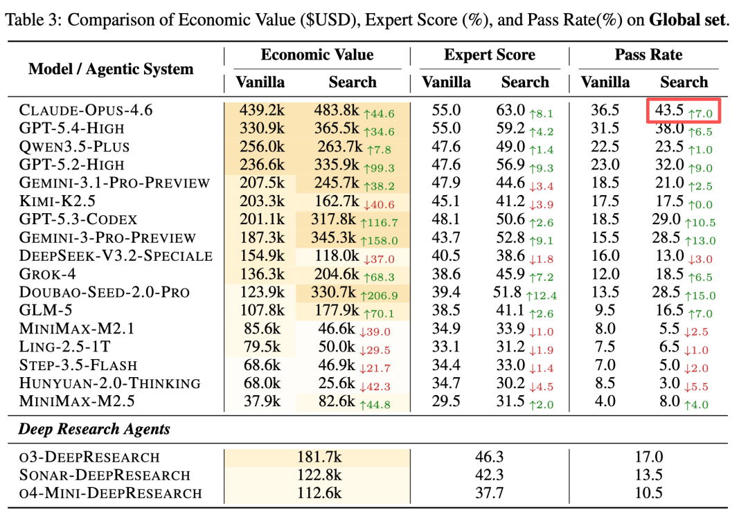这和$OneMillion-Bench设置“通过率”的逻辑完全一致——平均分反映技术能力,通过率才反映“经济图灵测试”是否过关。