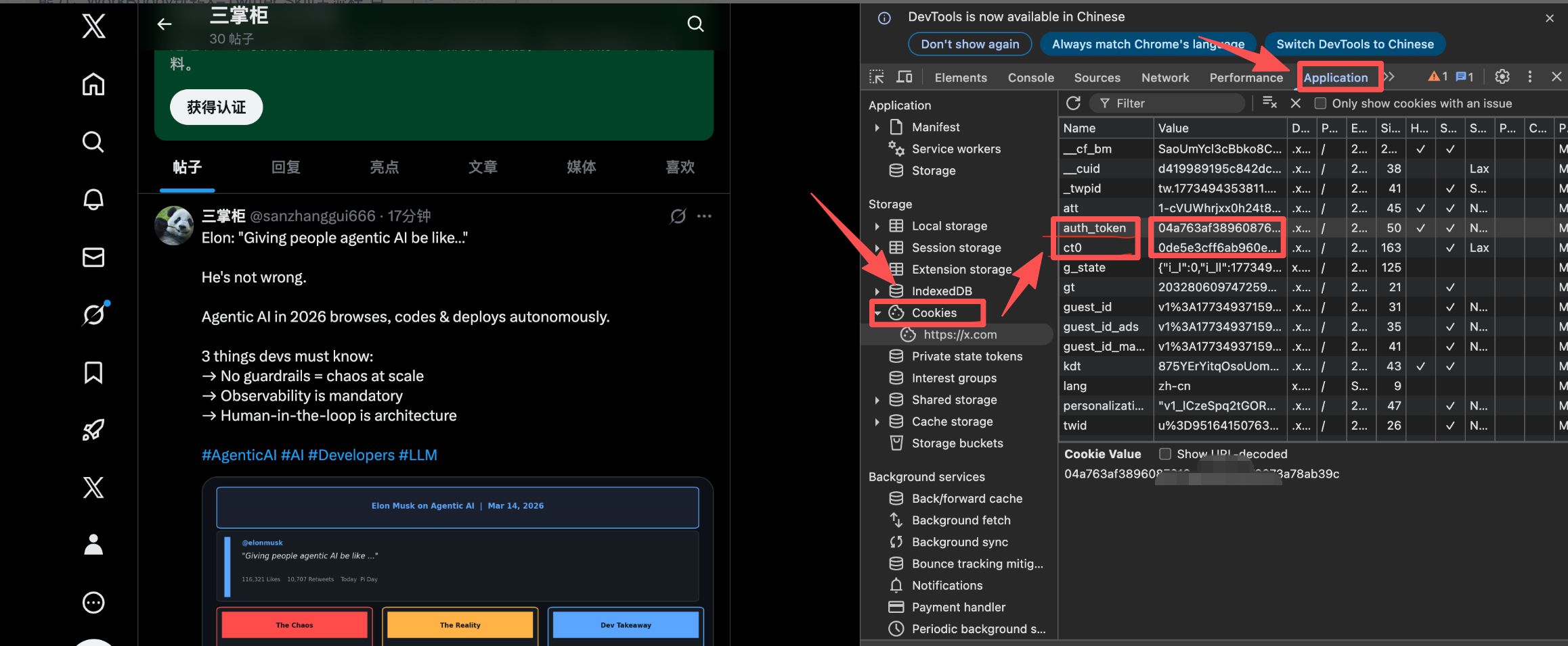 账号授权通过:提供auth-token与ct0密钥(说明:大家一定要找到自己X账号登录之后的这两个参数值,不然会发送失败),示例: