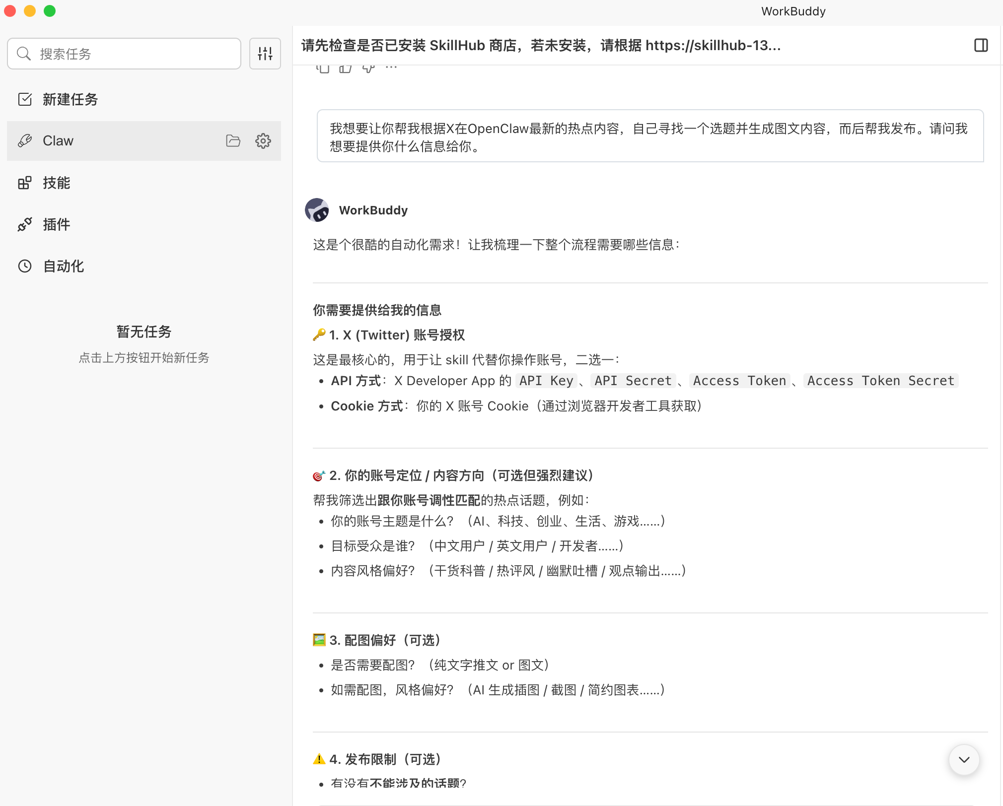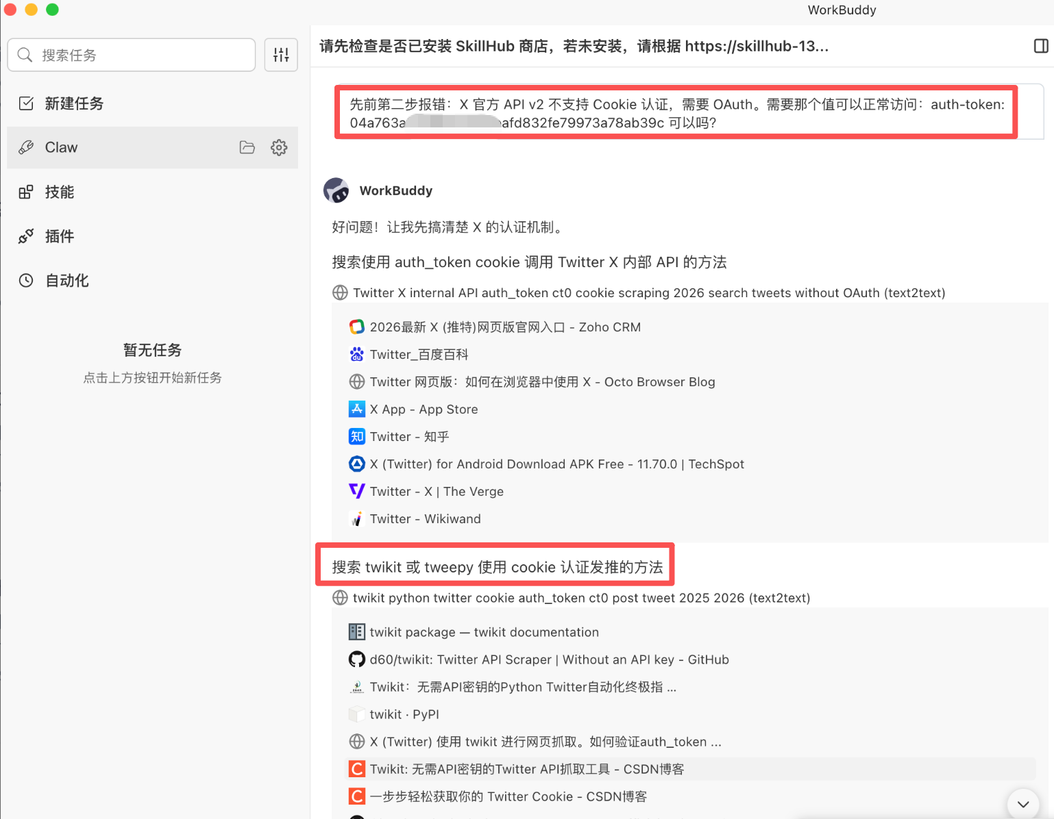 遇到这种情况,我们可以先复制系统完整的报错信息,向WorkBuddy发起询问,示例:“配置X-Twitter Skill时出现权限报错,报错信息为XXX,如何解决或需要提供什么信息能够解决?”,然后WorkBuddy会给出针对性的排查方案。