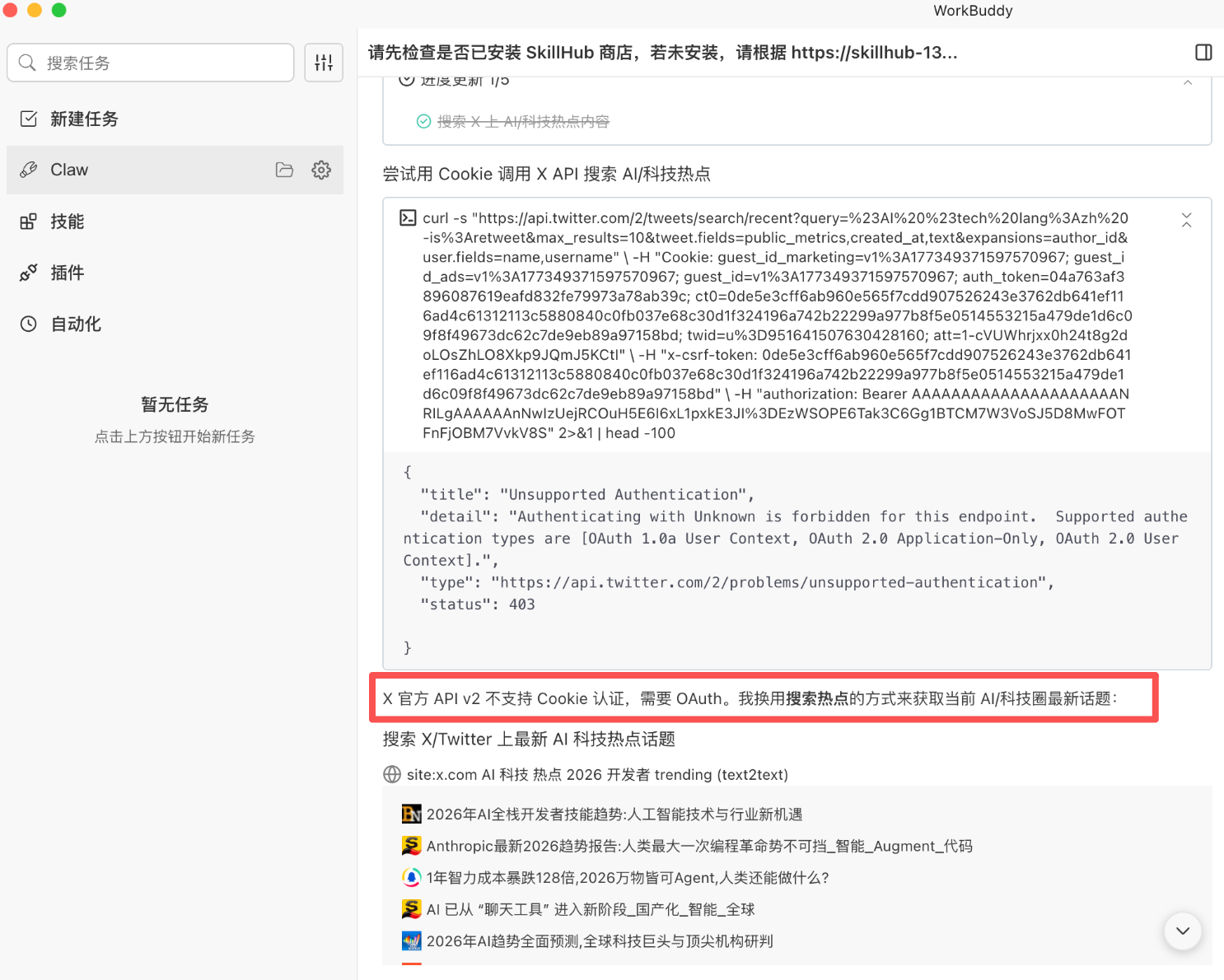 我在这一步的时候,遇到“x-twitter不支持X官方API v2 + Cookie”的 报错提示,然后WorkBuddy给出了解决方案。