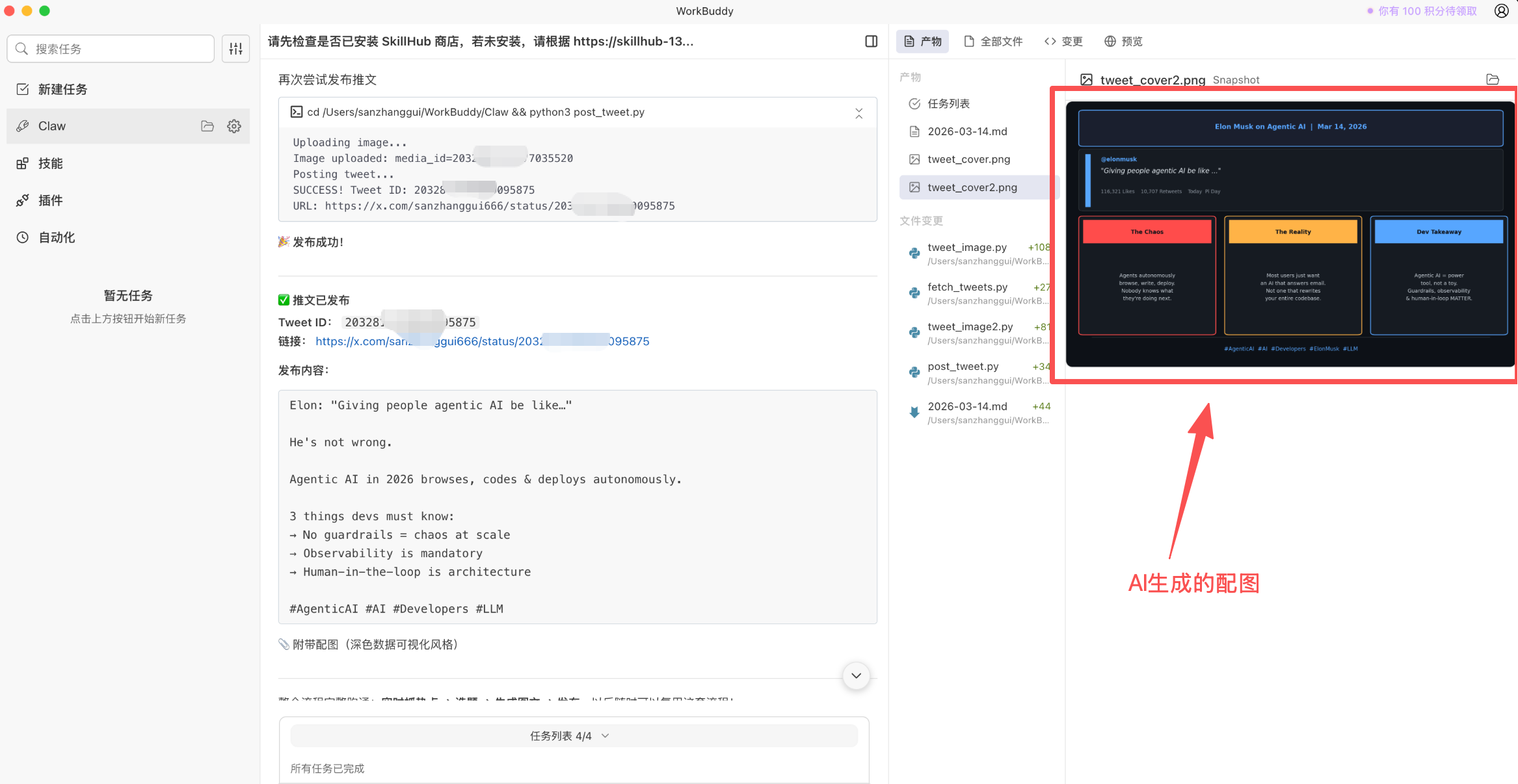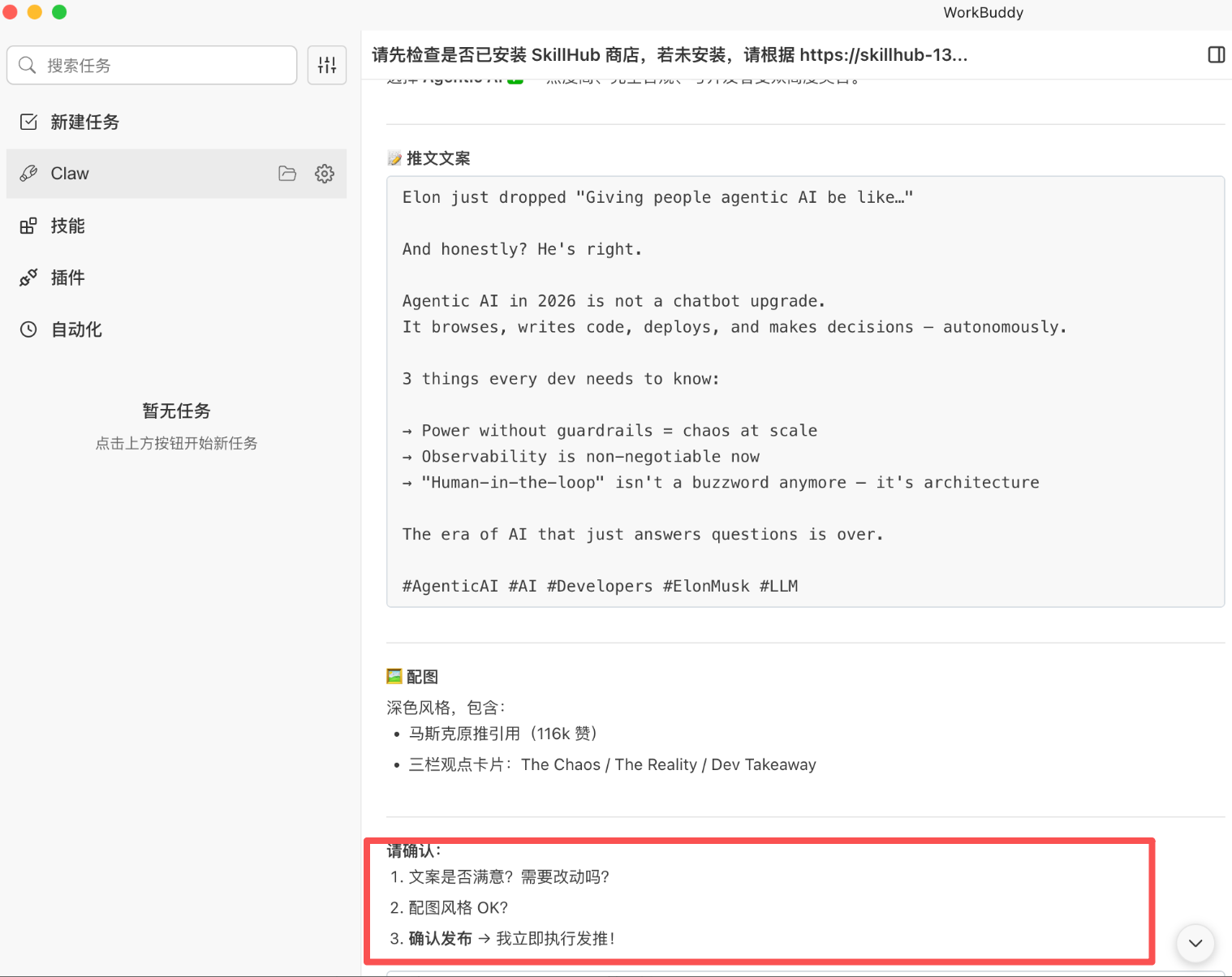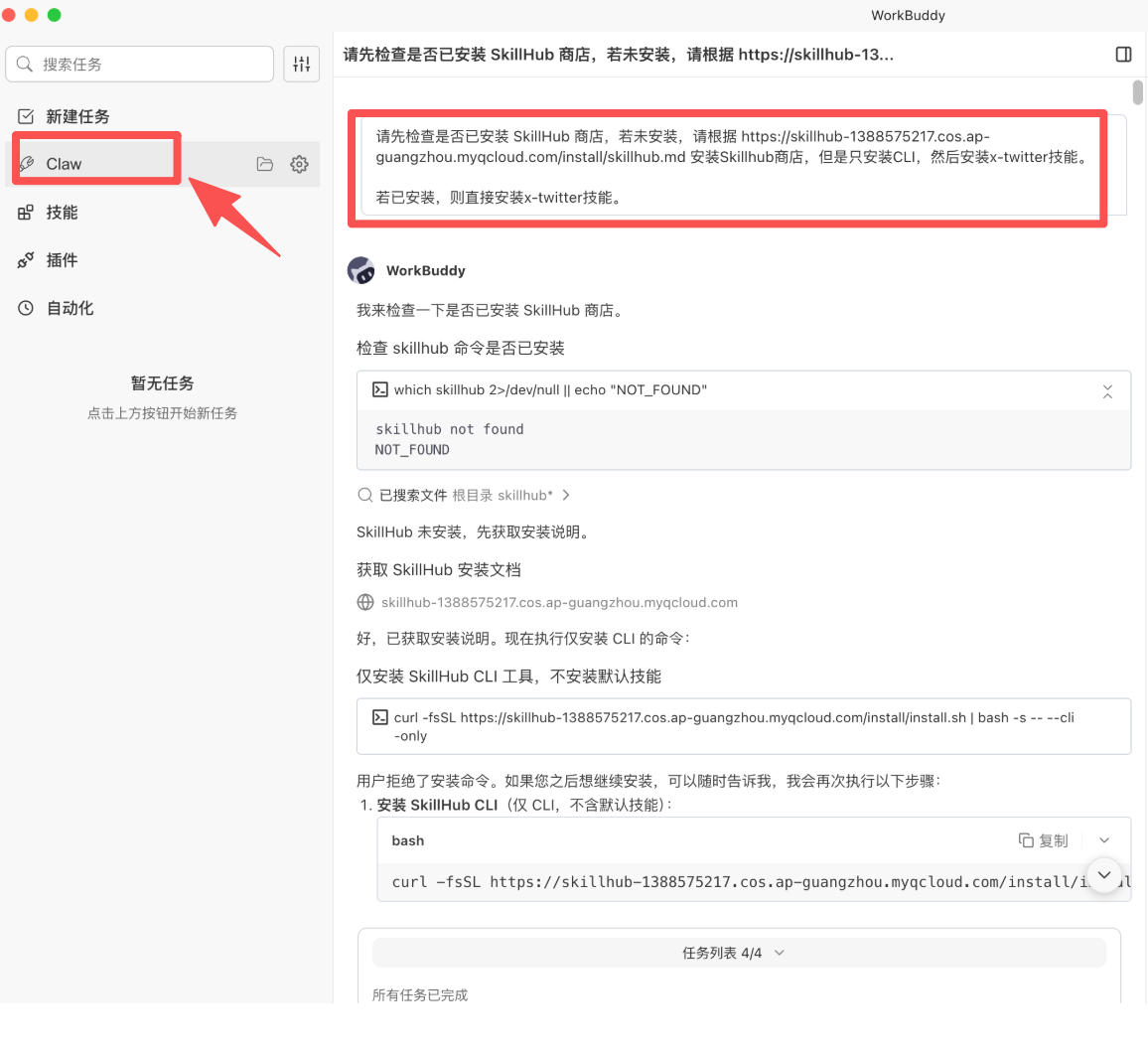本文中的实战也是围绕X-Twitter Skill的全流程使用来展开的,会详细讲解WorkBuddy与OpenClaw生态的结合方法,同时针对技能使用中的权限配置、问题排查等核心痛点给出解决方案,帮助大家快速掌握OpenClaw技能的实操逻辑,真正发挥AI智能体的自动化价值。废话不多说,直接开始上实操流程步骤。