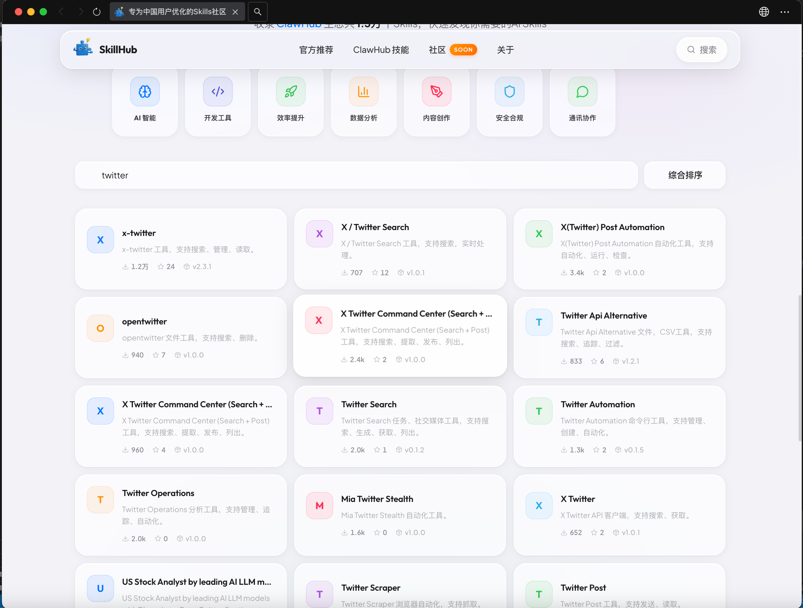 直接打开Skill集市官方地址:https://skillhub.tencent.com/ ,该平台为专为中国用户优化的AI Skills社区,提供高速下载与一键安装服务,收录了OpenClaw生态超1.3万款AI Skills,然后直接搜索twitter,找到 twitter。