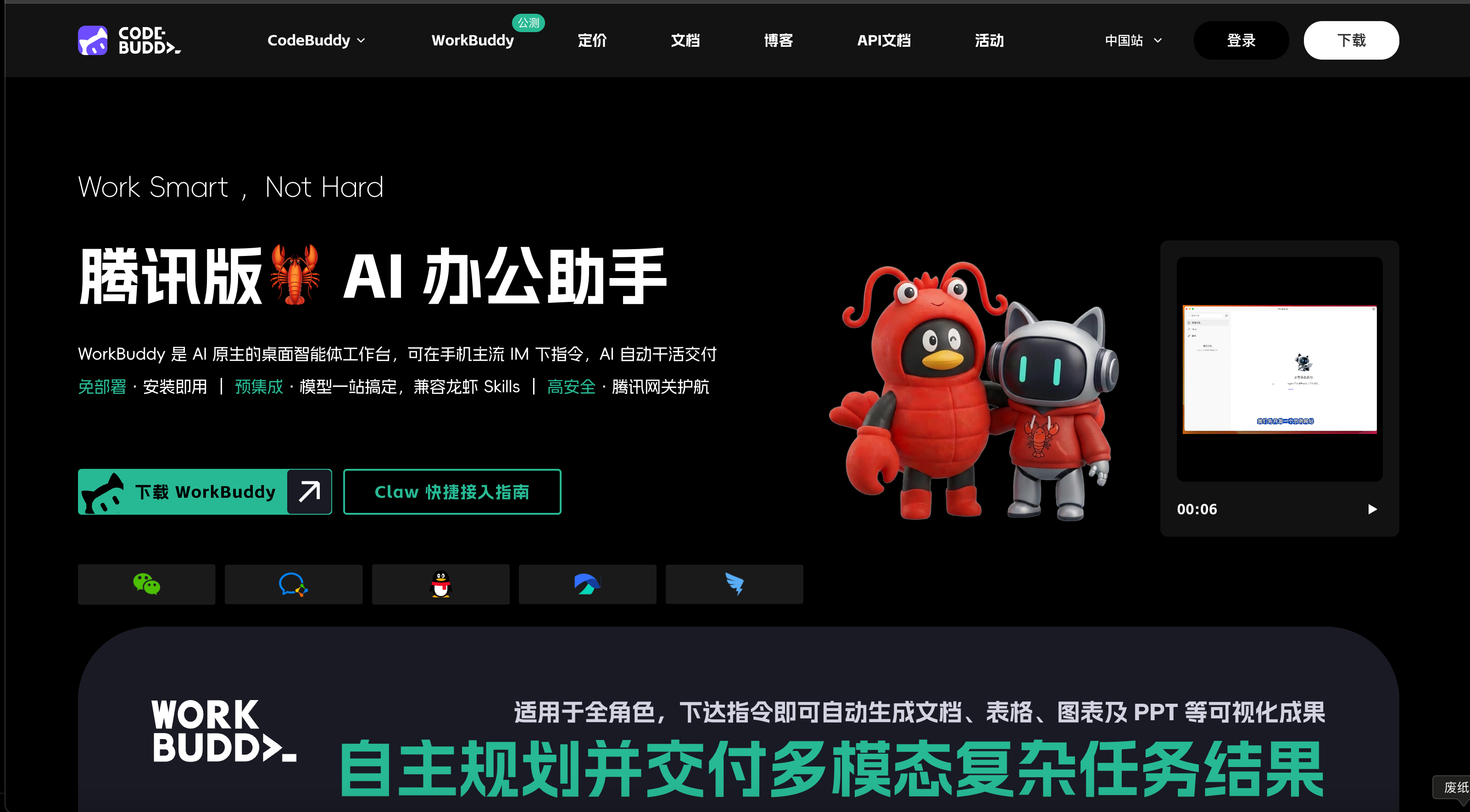 腾讯的WorkBuddy作为AI原生的桌面智能体工作台,是对接OpenClaw生态Skills的核心载体,首先我们需完成工具的安装与登录操作,具体的下载渠道,大家去【WorkBuddy官网下载】https://www.codebuddy.cn/work/ ,请大家根据自身操作系统(Windows/Mac)下载对应安装包。