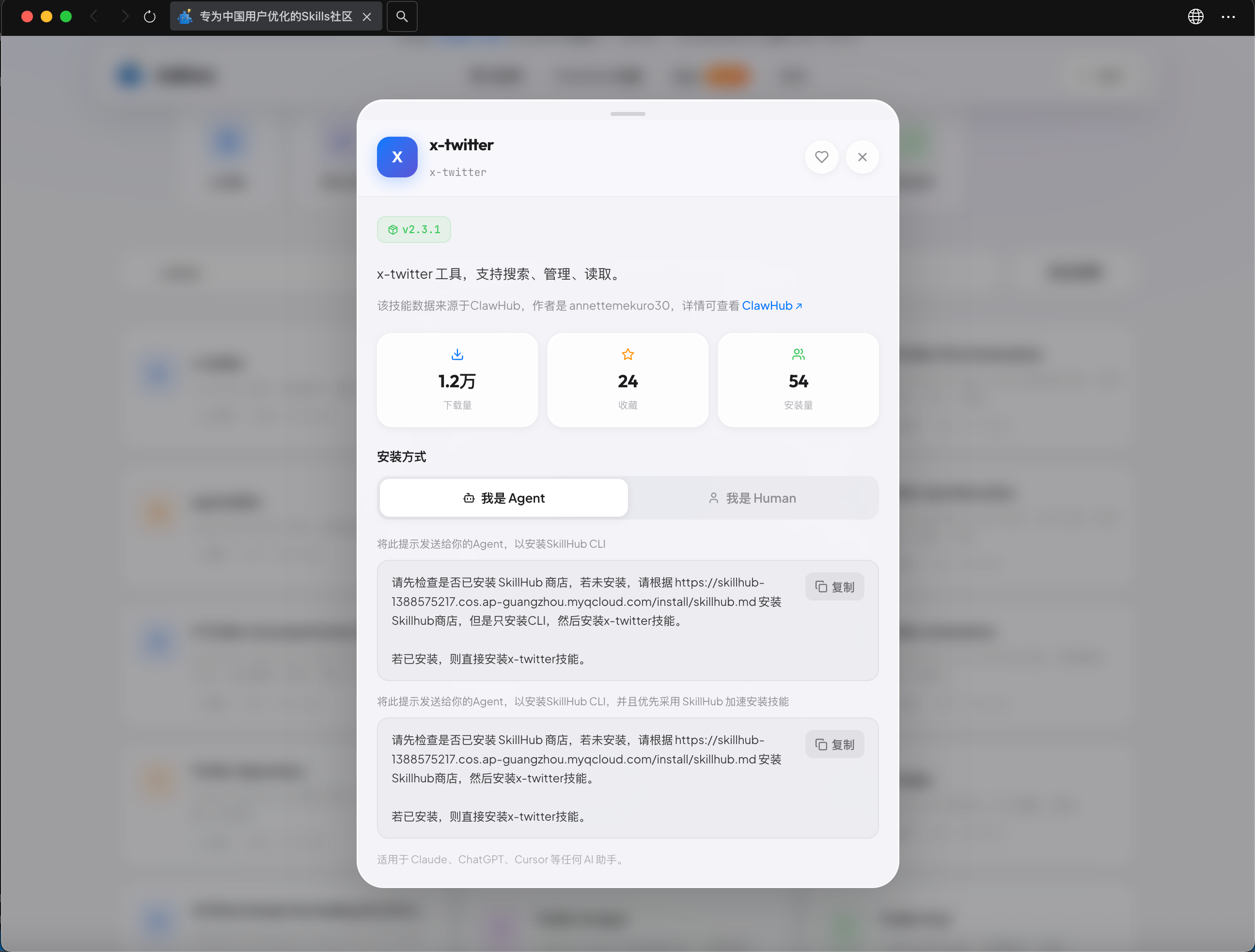 在检索结果中精准定位对应的X-Twitter Skill,查看技能基础介绍,确认其功能匹配自身使用需求,这里我选择的是“x-twitter”。