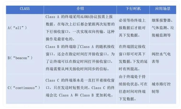 LoRaWAN规范定义了三种设备类型:A类、B类和C类,这三类设备基本上能覆盖物联网所有的应用场景。所有LoRaWAN设备都必须实现A类,而B类和C类是A类设备规范的扩展,所有设备类别都支持双向通信(上行链路和下行链路)。