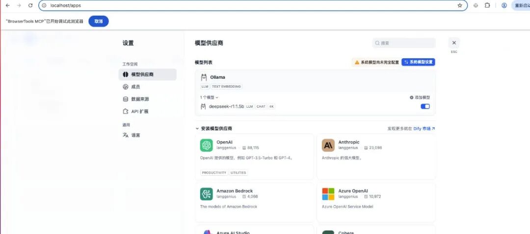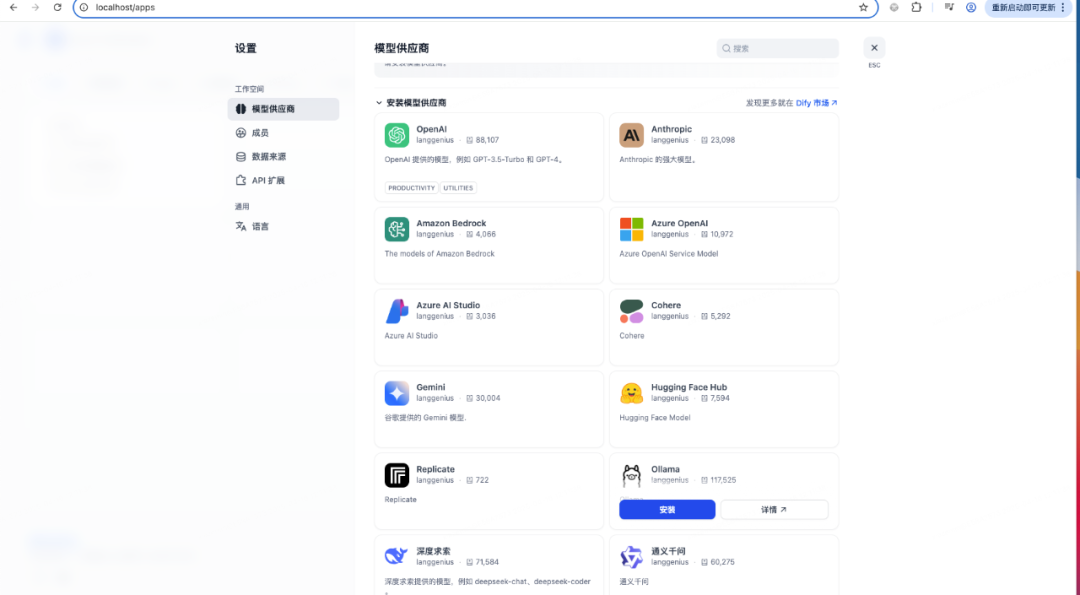 选择模型供应商,这里有目前市面上大量的模型供应商,为了使用deekseek,模型供应商选择ollama,使用之前需要安装ollama插件
