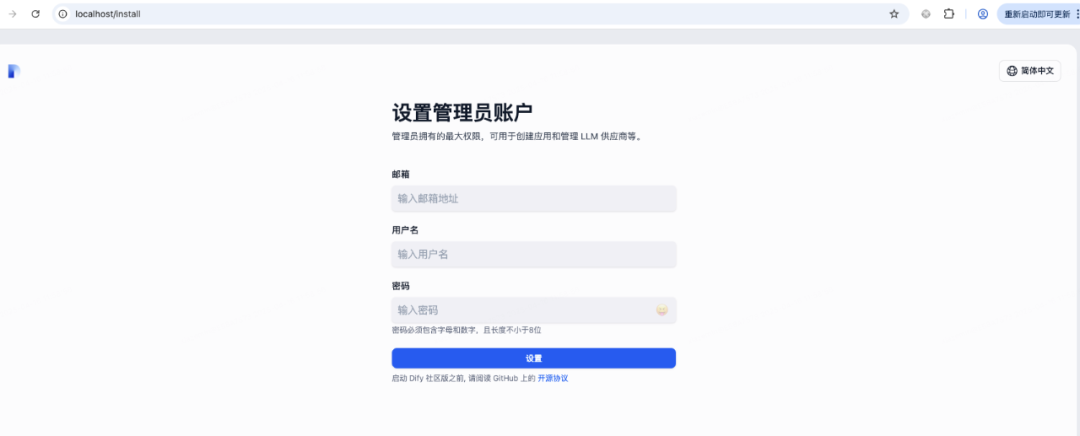 ⠿ Container docker-weaviate-1 Started 2.1s然后我们登录网页http://localhost/install设置用户名和密码