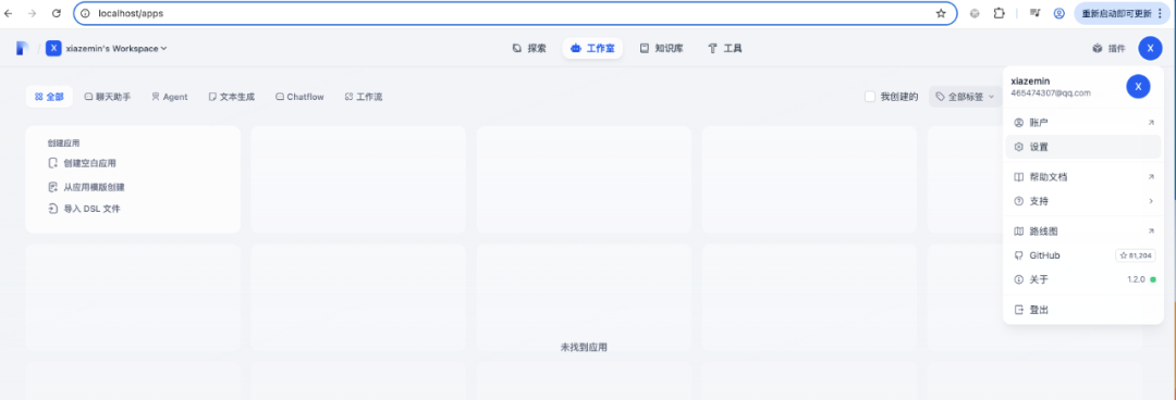 有了知识库之后,我们需要介入大模型来实现聊天功能。点击右上角的头像,在下拉列表里选择设置: