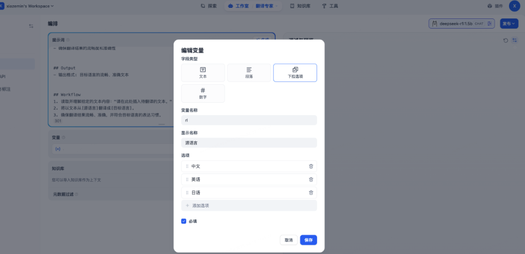 比如我们要实现一个翻译专家,可以在左上角填写prompt模板,并且支持参数