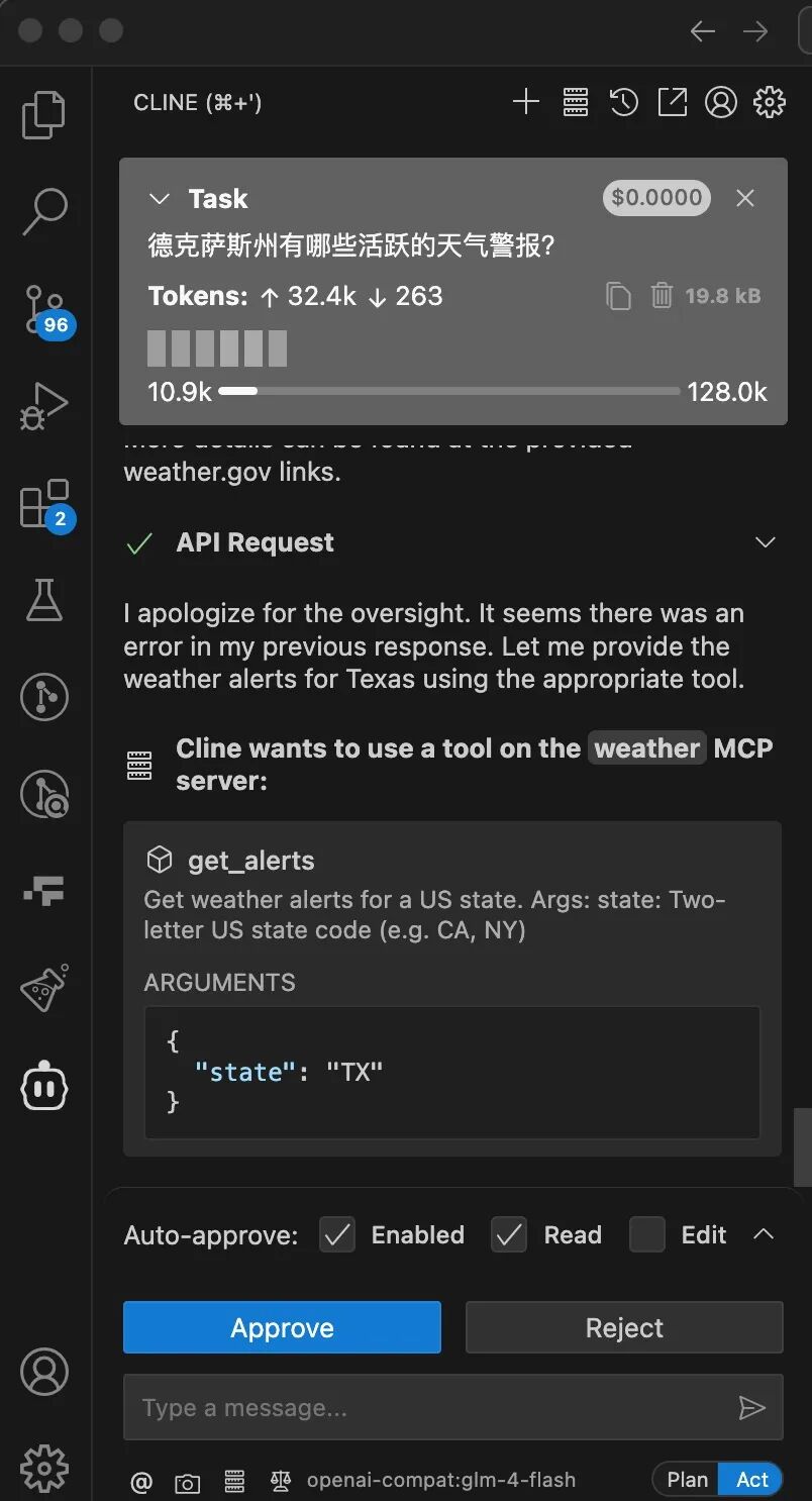 上一节的MCP server的例子是基于STDIO协议的,所以本节我们来分析下STDIO协议下的完整交互流程。为了方便观察整个流程,我们在Cline和MCP server之间架一个STDIO的代理,本质上就是一个管道,伪装成一个MCP server,把Cline的请求转发给MCP server,把MCP server的返回转发给Cline,作为中间商必须要赚差价——记录下往来的消息内容,完整代理内容如下: