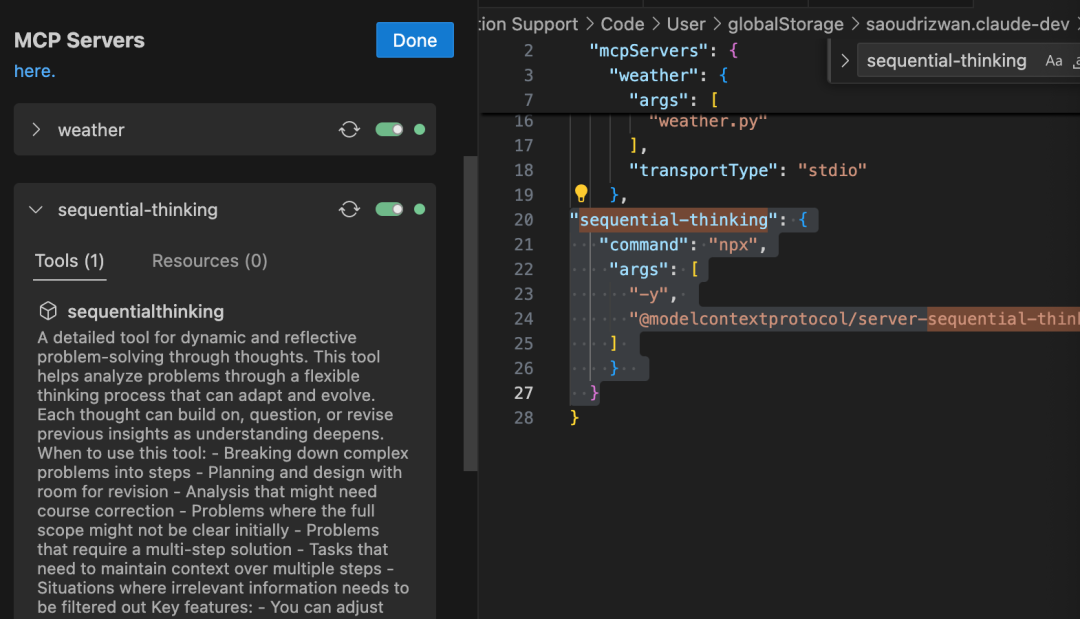 Sequential Thinking MCP Server running on stdio在cline上配置mcp server