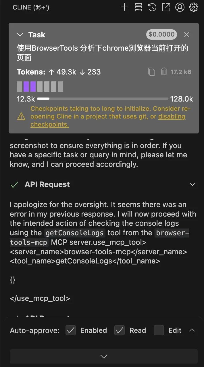 Cline tried to use browser_action without value for required parameter 'action'. Retrying...整体来说,如果不使用Claude,这个插件很难完成我们预期的目标。