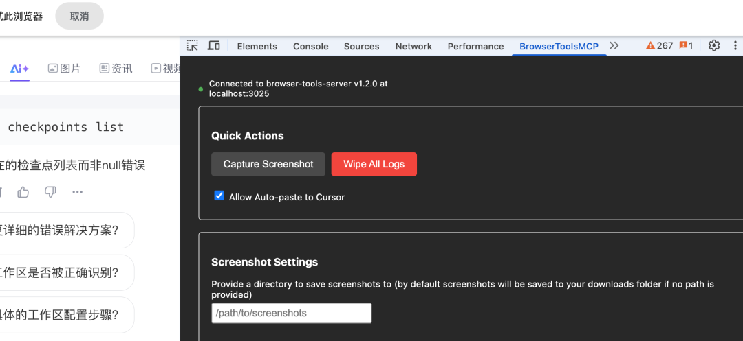 } 测试可以连接成功,最后我们安装下hrome 的BrowserTools 插件,下载地址是https://github.com/AgentDeskAI/browser-tools-mcp/releases/download/v1.2.0/BrowserTools-1.2.0-extension.zip,下载完成后添加到浏览器插件,重启浏览器后,当我们打开浏览器就可以看到