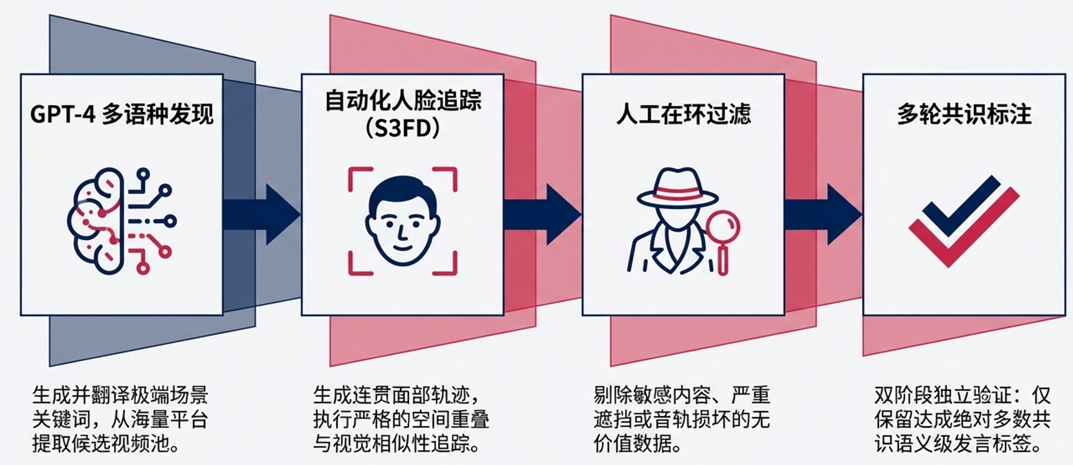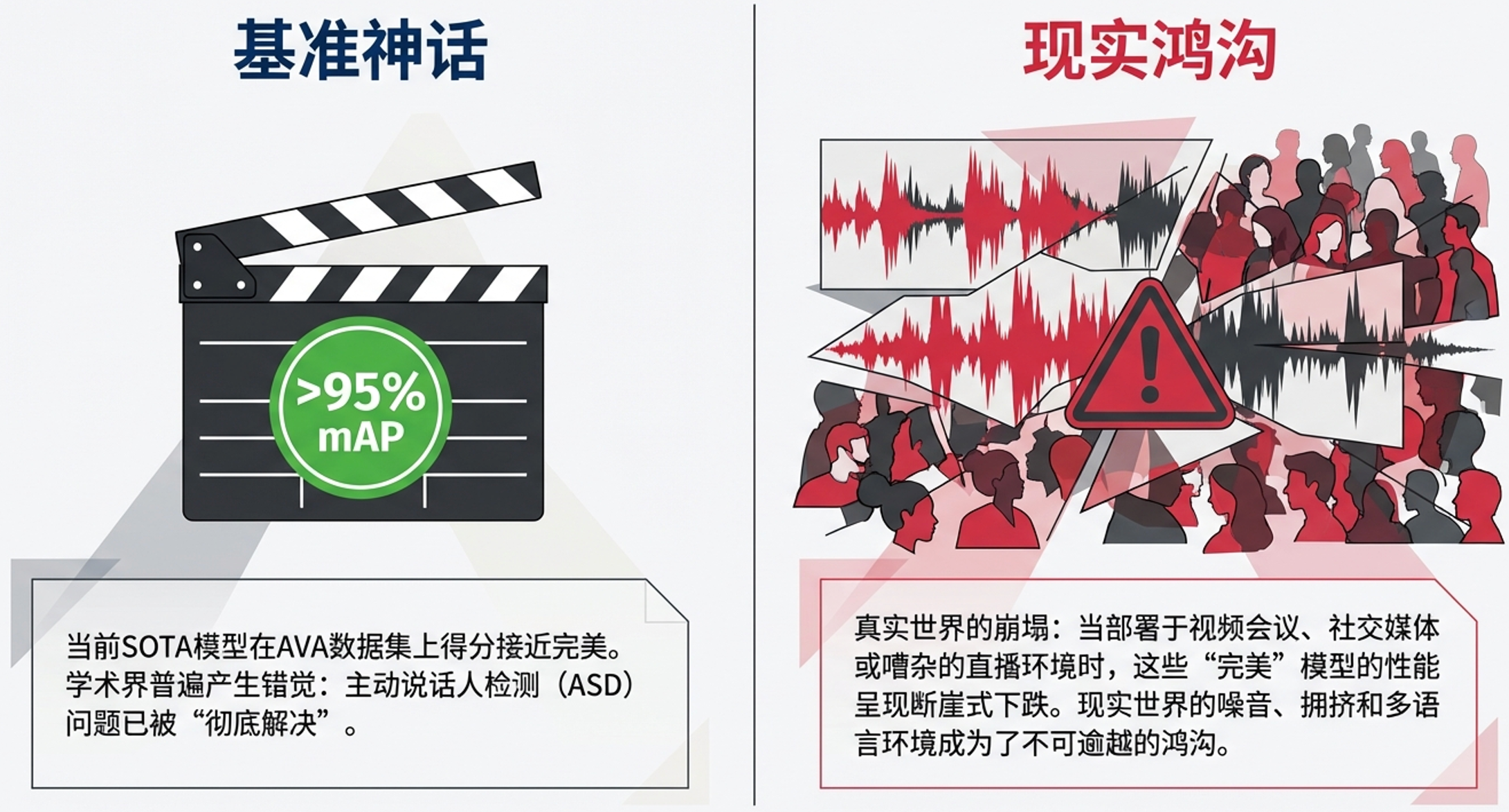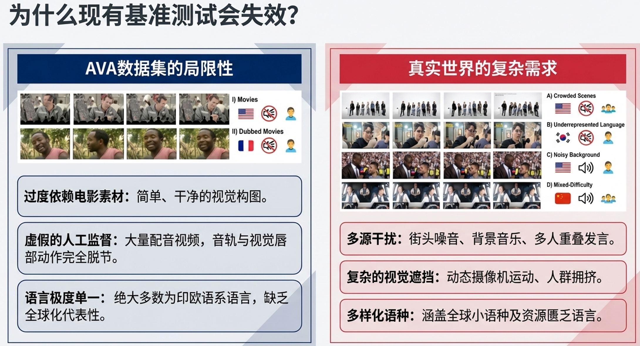 活跃说话人检测(ASD)任务在许多下游应用中起着至关重要的作用,包括说话人日志(Speaker Diarization)、音视频语音识别(Audiovisual Speech Recognition)以及人机交互(Human-Robot Interaction)。 在实际的商业与生活部署中,UniTalk所针对的场景完美契合了现代真实世界的需求,例如视频会议、社交媒体短视频以及现场直播。在这些场景中,模型必须处理极其复杂的状况,如未被充分代表的小语种、嘈杂的背景音(街道声音、音乐或重叠语音)以及涉及多人、遮挡或动态镜头运动的拥挤画面。