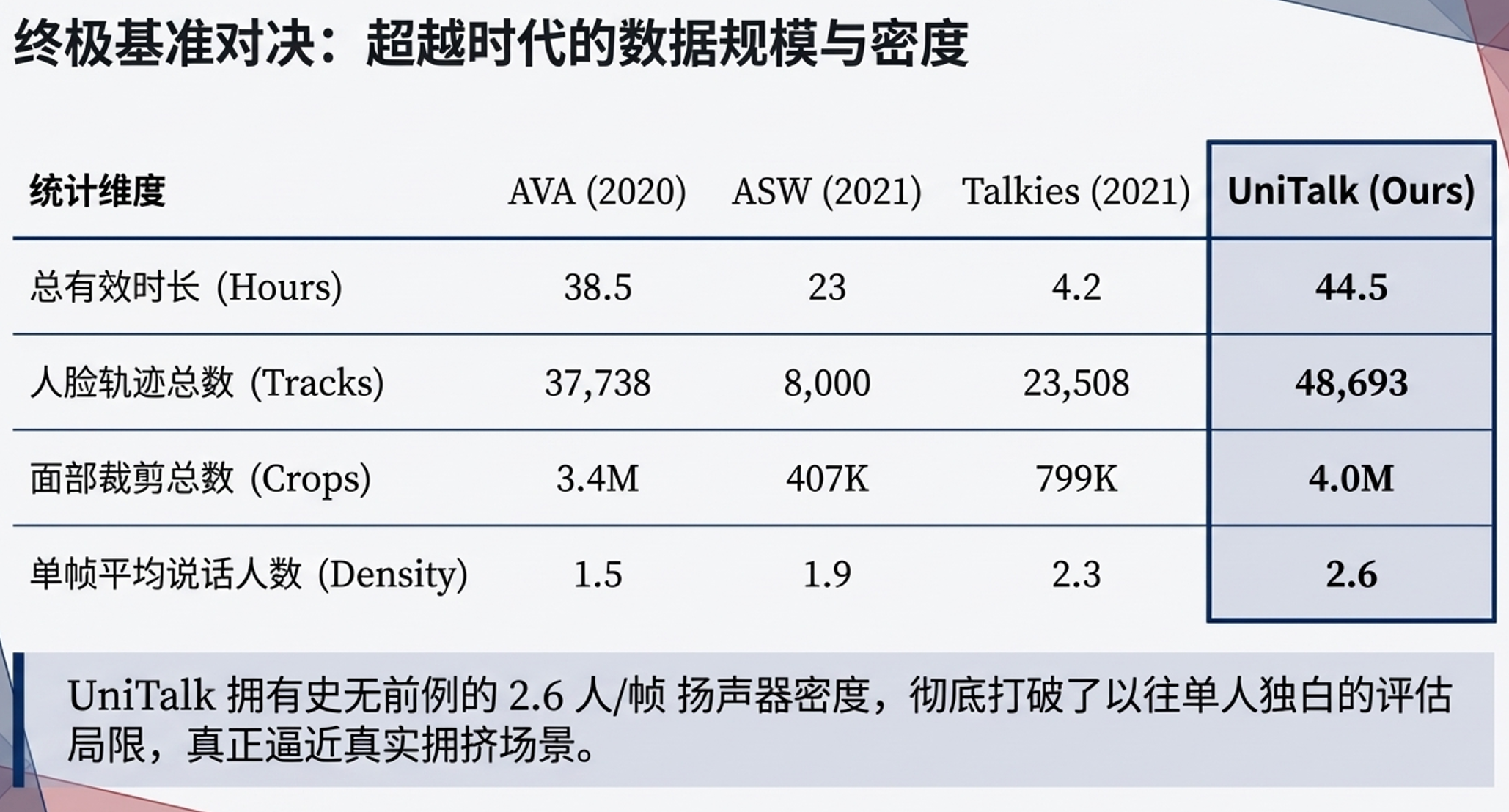 AVA数据集长期以来是ASD任务的事实基准,但它几乎完全基于电影(尤其是老电影)构建,存在显著的“领域差距(Domain Gap)”。相比之下,UniTalk具有以下压倒性优势: