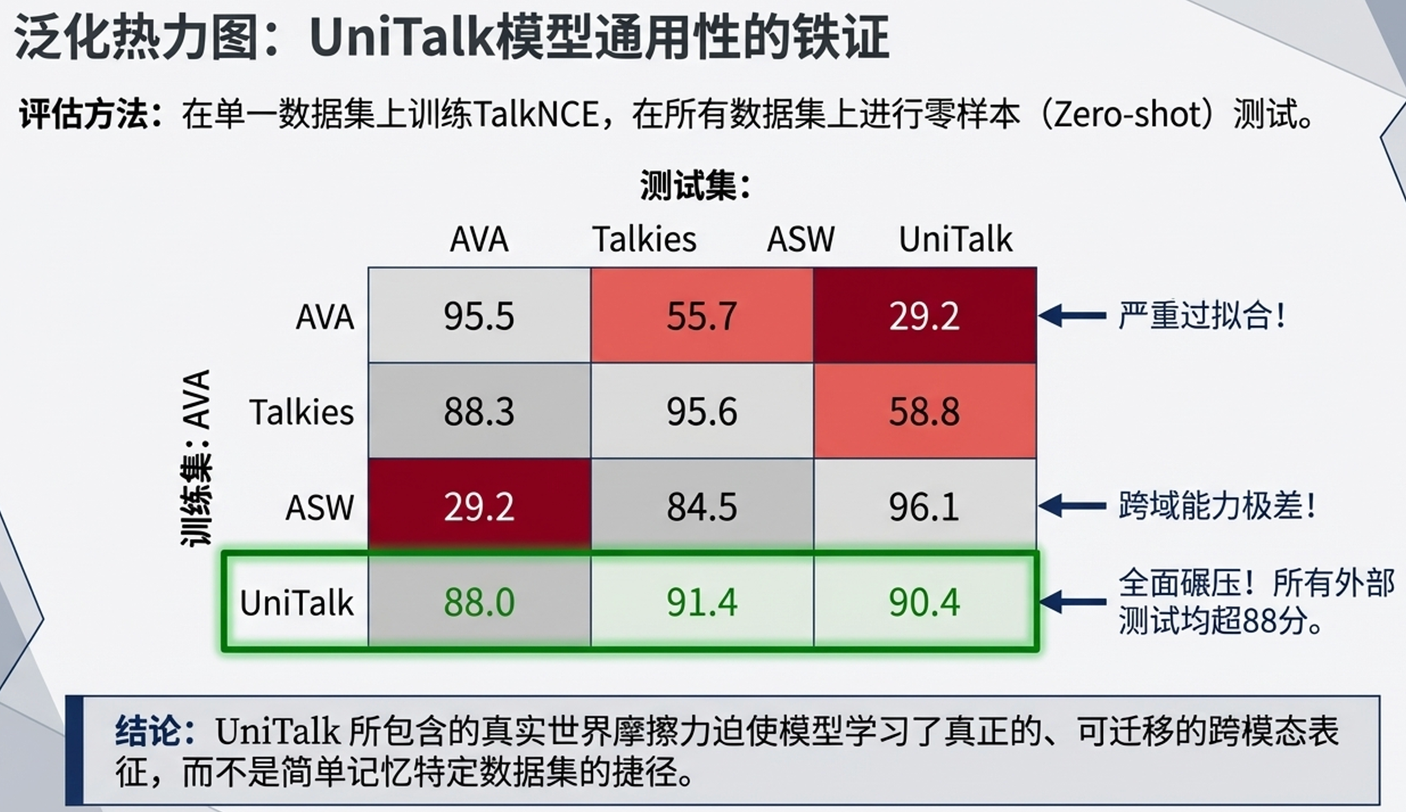虽然UniTalk极具挑战性,但它提供了极其优质的泛化特征。实验表明,在UniTalk上训练的模型在未见过的真实数据集(如Talkies和ASW)上展现出了极强的零样本迁移能力(得分均在90 mAP以上)。此外,将UniTalk预训练的模型在AVA上进行微调,仅需3小时的AVA数据即可迅速达到92.4 mAP,使用全量数据可达95.7 mAP,同时还能保持在UniTalk本域上的优异表现。这证明了UniTalk不仅是一个严苛的测试场,更是通向通用ASD模型的优秀“预训练教练”。