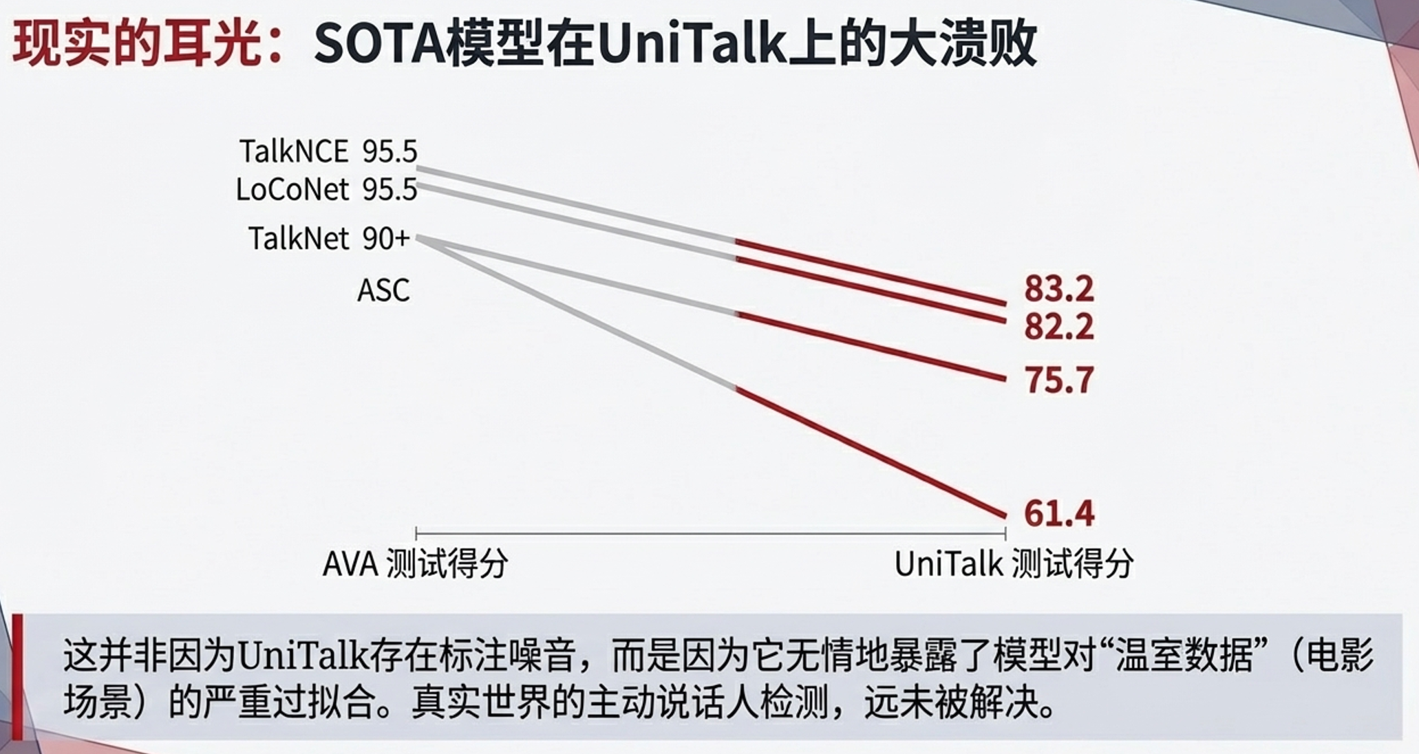 UniTalk将测试集细分为四个专门设计的“压力测试”子集: