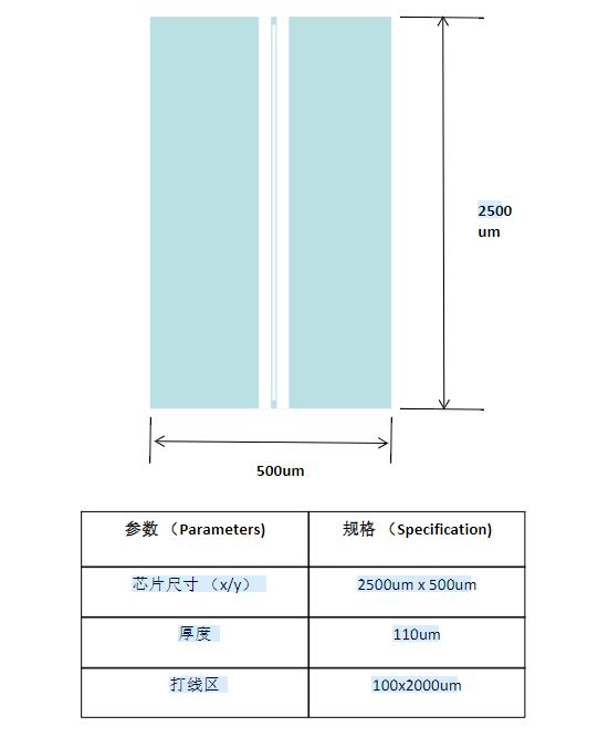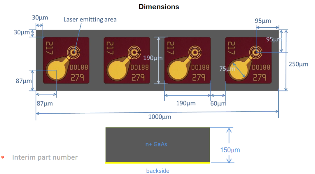 5um的ridge做出来之后,如何套刻出4um的欧姆接触窗口区是个技术和设备问题,对于5um的线条可以用接触曝光机,控制PR和工艺,问题不大,二次套刻就需要stepper光刻机。不用stepper也可以用半曝光或者叫自适应曝光技术,开出5um的接触区。另外一种采用剥离工艺去除 SiO2 制作出 5 μm 电极窗口。但是两种都有很多技术不稳定性,不如stepper的方案。对于一些蝶形封装的也有芯片较大的。比如下面的这个厂家芯片: