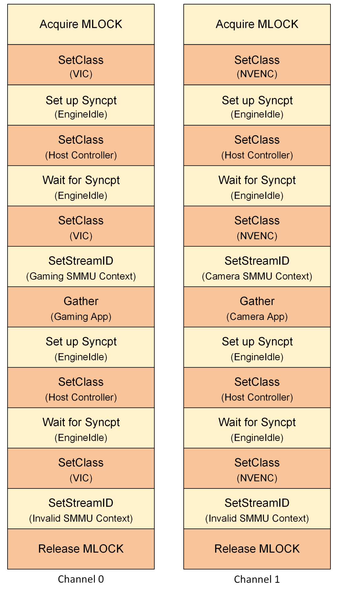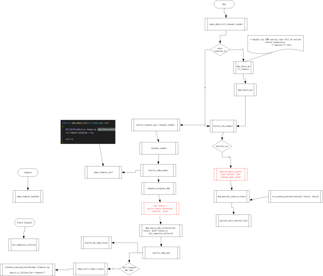 Host1x 为orin/thor中的硬件模块,为各子系统(isp/codec/gpu/pva/ofa/cpu等) 提供编程与控制接口。cmd既可从内存中的push-buffer提供,也可由CPU直接提供,随后通过host1x通道传输至主机控制器后端的客户端。这些通道还通过硬件同步点信号(Syncpts)实现了软件与独立模块之间,以及各模块之间的同步机制,当Syncpts 到达时,以中断的方式通知ACPU,完成数据(camera picture、模型推理数据、vi、isp等)在各子系统间的流转,从而完成相关功能。