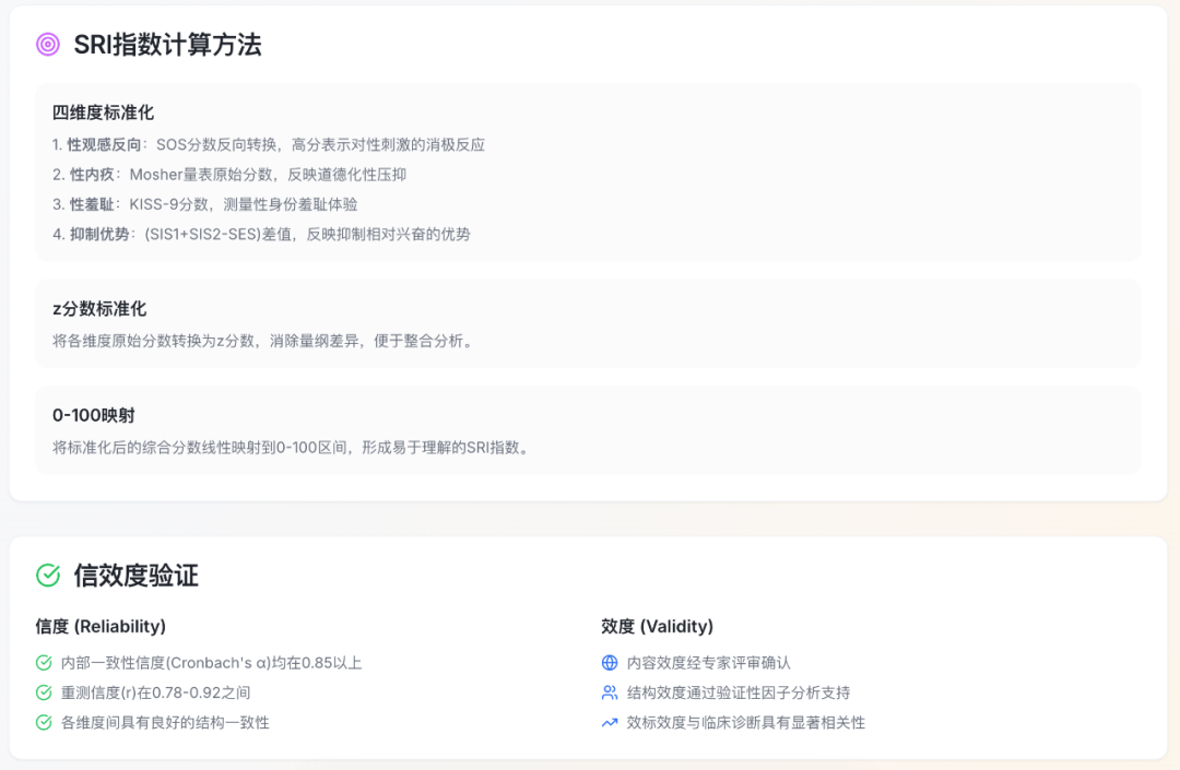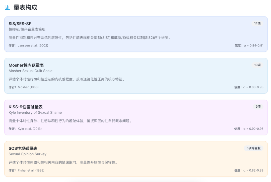 它综合使用了多个经典心理学量表(例如 SIS/SES、Mosher 性内疚量表、KISS-9、SOS等),最后生成一个“性压抑指数”和详细的维度报告。