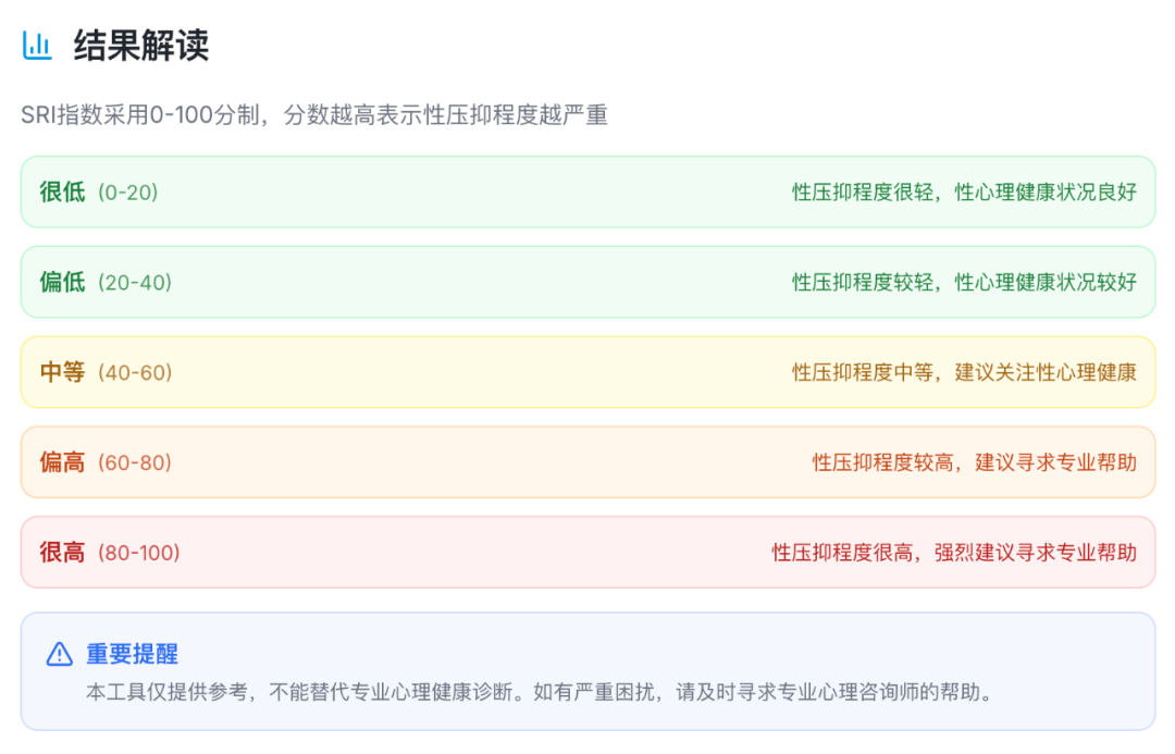 SRI指数采用0-100分制,分数越高表示性压抑程度越严重!