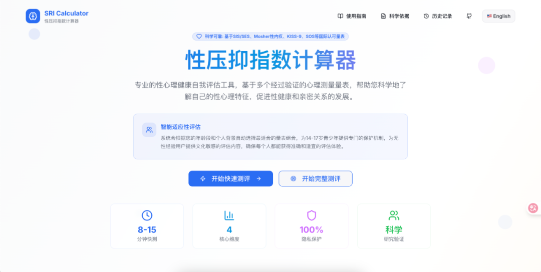 性压抑指数计算器是一个专业的性心理健康自我评估工具,基于多个经过验证的心理测量量表,帮助您科学地了解自己的性心理特征,促进性健康和亲密关系的发展。