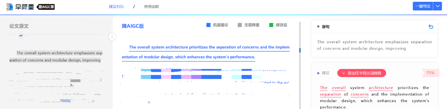 如果修改内容比较多或时间又紧的情况下,就借助降AI率工具进行修改,比如早降重辅助工具。