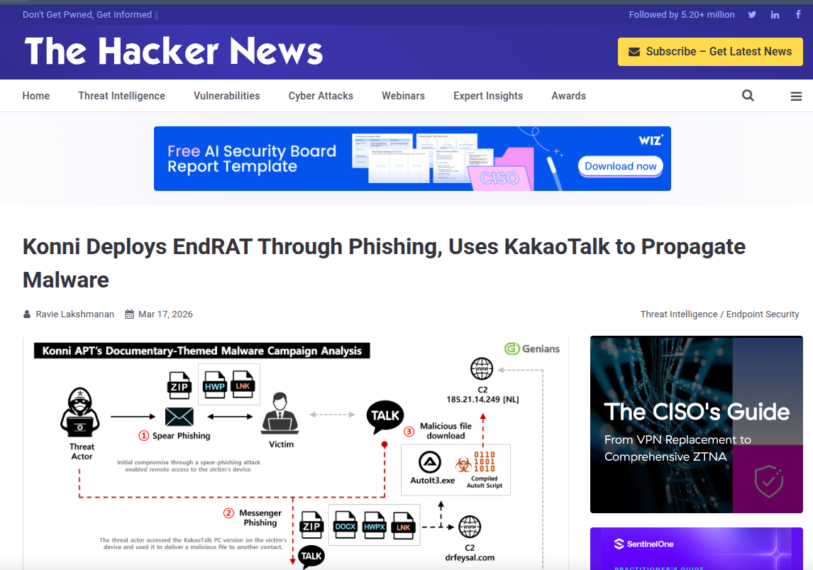 2026年3月披露的最新情报显示,Konni组织针对涉及朝鲜人权议题的目标发动了精心策划的鱼叉式钓鱼攻击。攻击者伪装成任命通知,诱导受害者执行嵌入恶意代码的Windows快捷方式(LNK)文件。一旦执行,受害者不仅会被植入功能强大的EndRAT(EndClient RAT),其本地的KakaoTalk即时通讯会话也会被攻击者接管。攻击者利用这一受信渠道,向受害者的联系人发送带有恶意附件的消息,从而将受害者转化为攻击跳板,实现病毒式的横向扩散。这种“利用受害者身份攻击其社交圈”的策略,极大地提高了攻击的成功率,因为来自熟人的消息往往能绕过人类的警惕心理和自动化的安全过滤。
