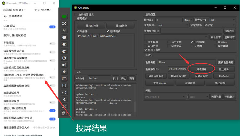 4) 点击“启动服务”,安卓屏幕就投屏到了电脑上: