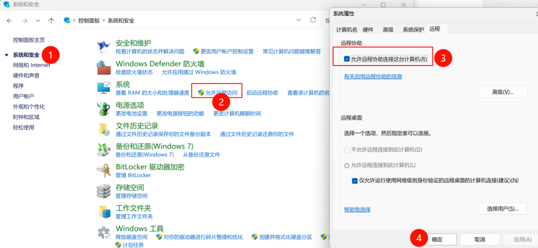 2进入「系统和安全」>「允许远程访问」。
