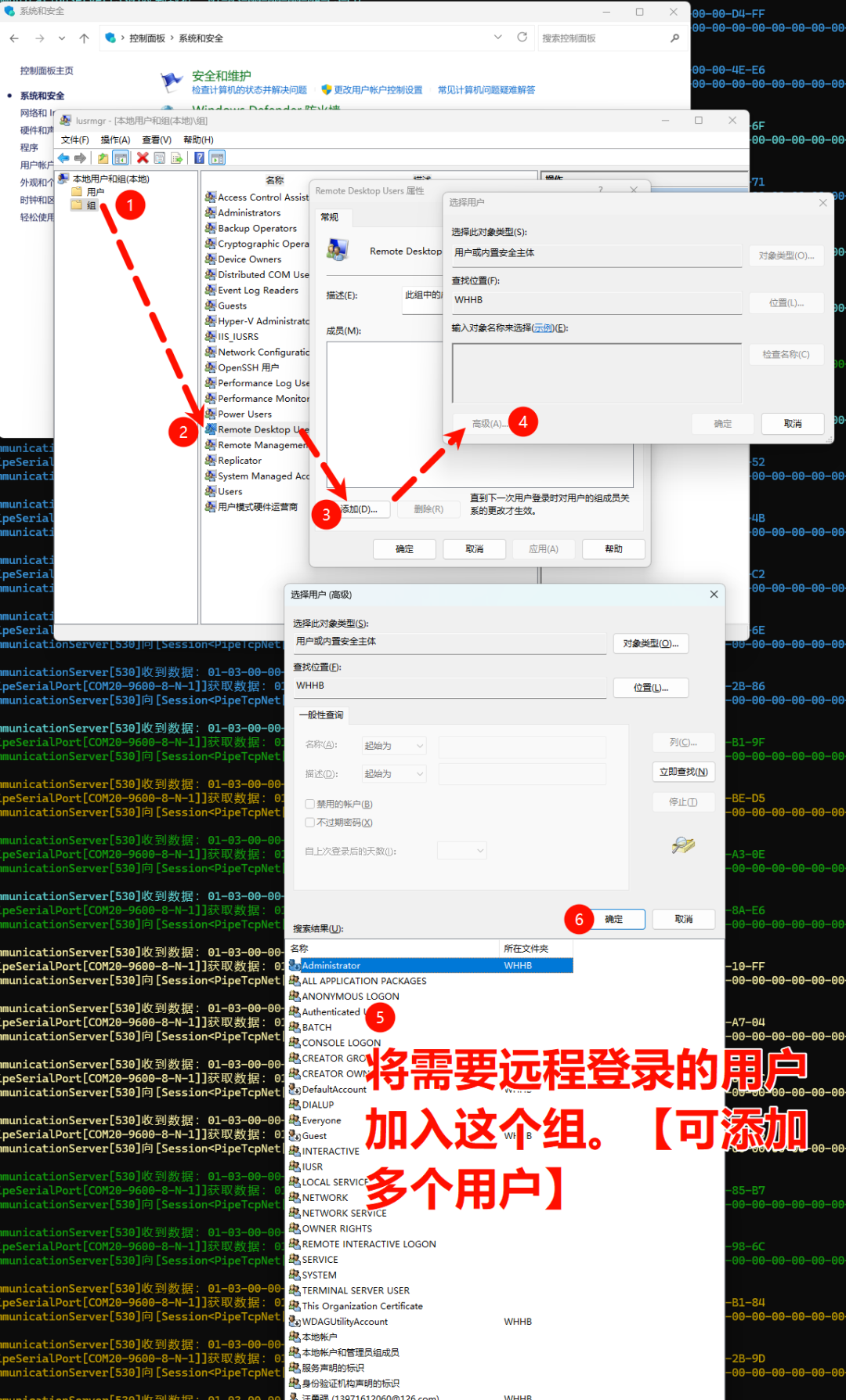 3点击「添加」按钮,将需要远程登录的用户加入这个组,授予其远程登录权限。