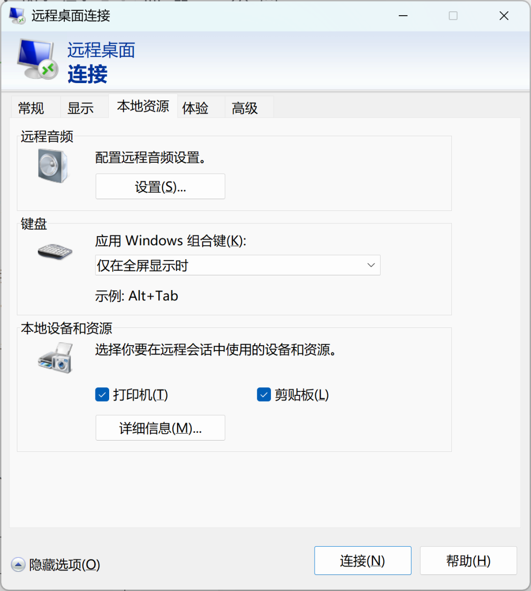 「远程桌面连接」应用提供了丰富的配置选项,这里介绍 2 个常用功能: