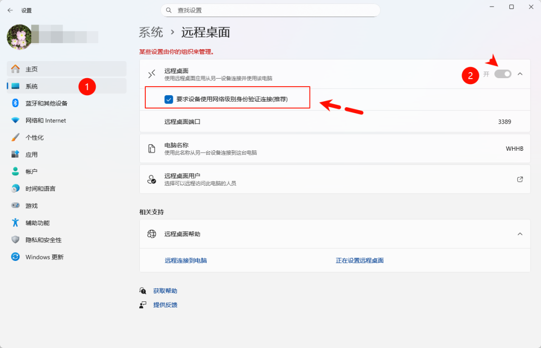 2打开「远程桌面」开关,并勾选「要求设备使用网络级别身份验证连接(推荐)」选项。