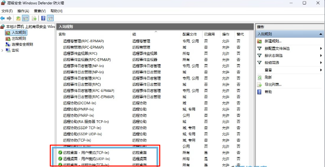 2在「入站规则」中,查看和管理 RDP 相关规则。