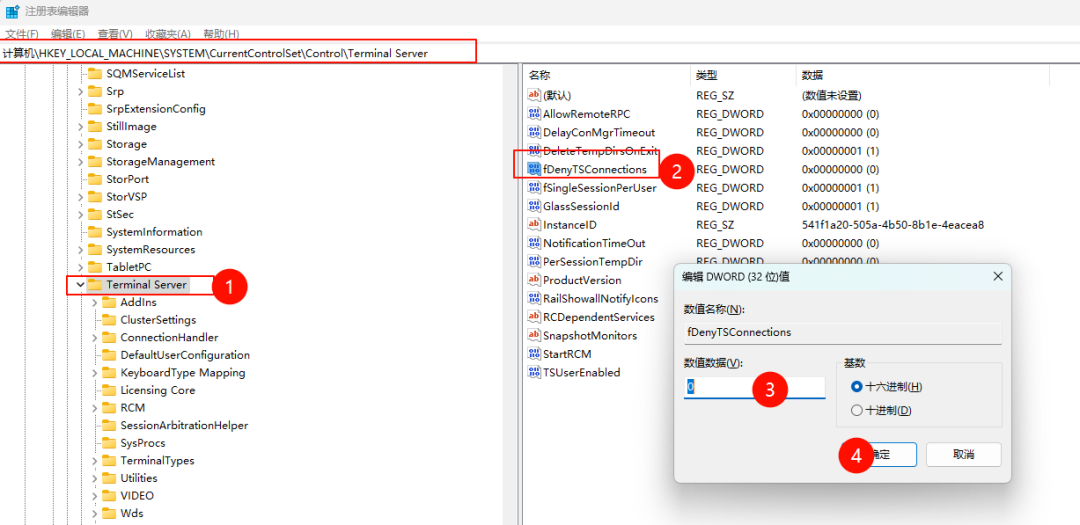 HKEY_LOCAL_MACHINE\SYSTEM\CurrentControlSet\Control\Terminal Server3双击名为fDenyTSConnections的 DWORD (32 位) 值,并将其值设置为: