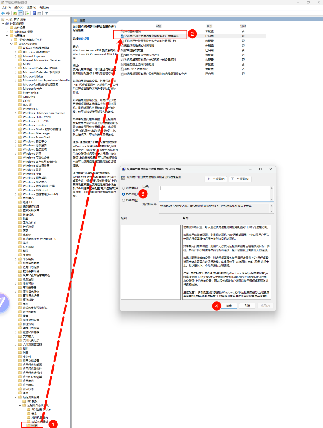 启用「允许用户通过使用远程桌面服务进行远程连接」策略