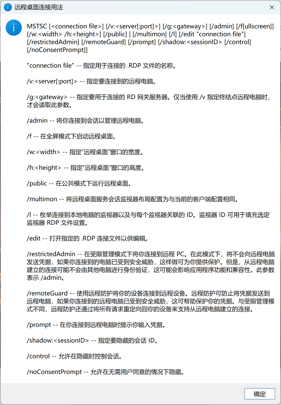 如前所述,如果你不想每次连接都进行参数配置,mstsc命令也支持多种快捷参数: