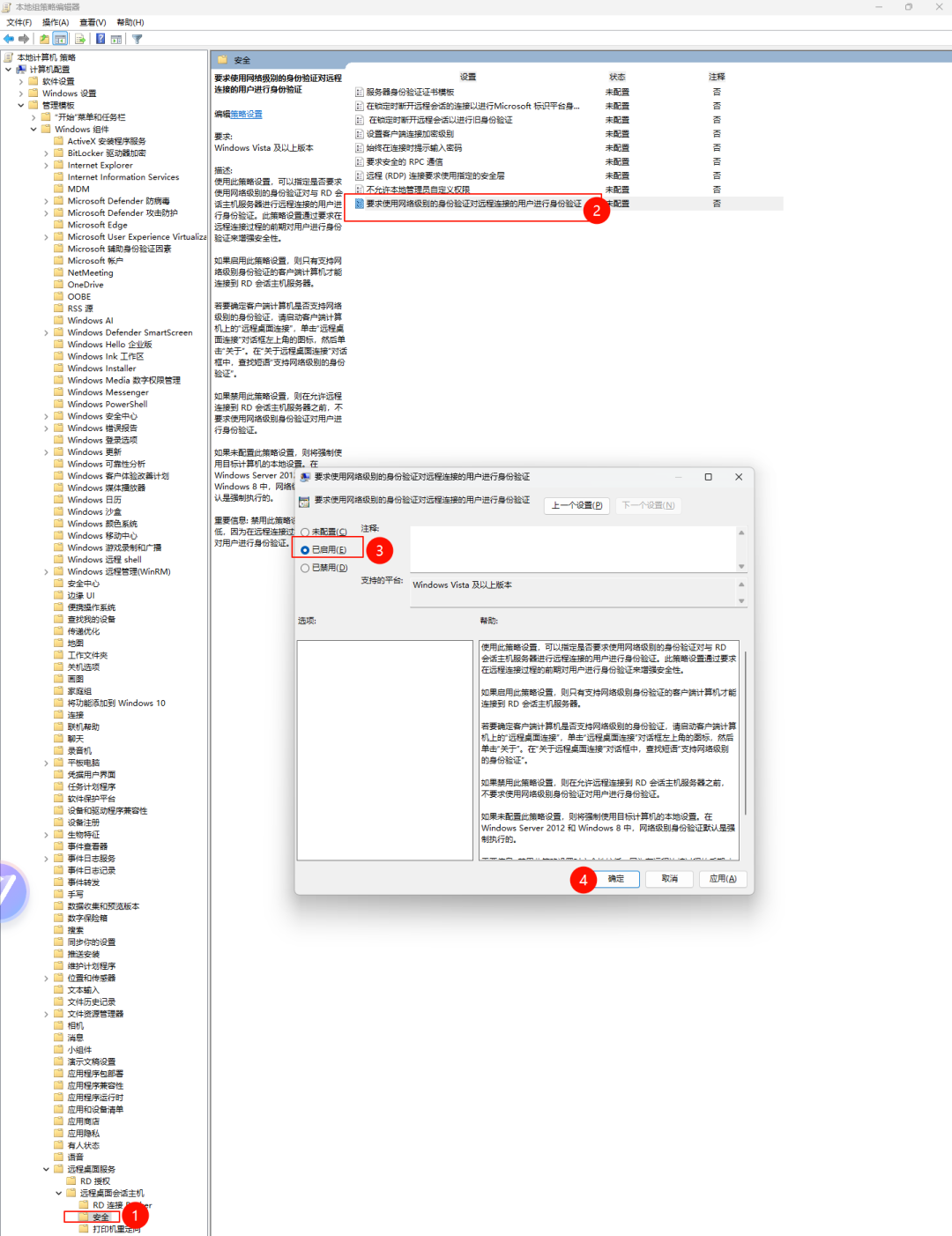 启用「要求使用网络级别的身份验证对远程连接的用户进行身份验证」策略