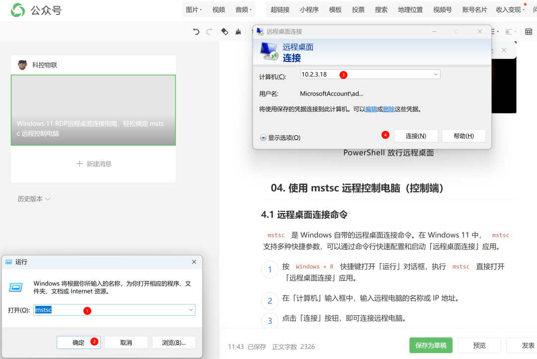mstsc是 Windows 自带的远程桌面连接命令。在 Windows 11 中,mstsc 支持多种快捷参数,可以通过命令行快速配置和启动「远程桌面连接」应用。