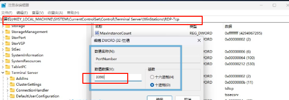 3双击名为PortNumber的 DWORD (32 位) 值,并将其「十进制」值修改成新的端口,例如3390