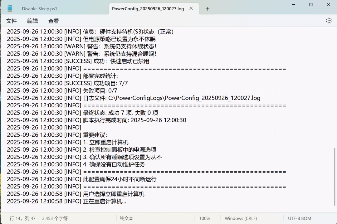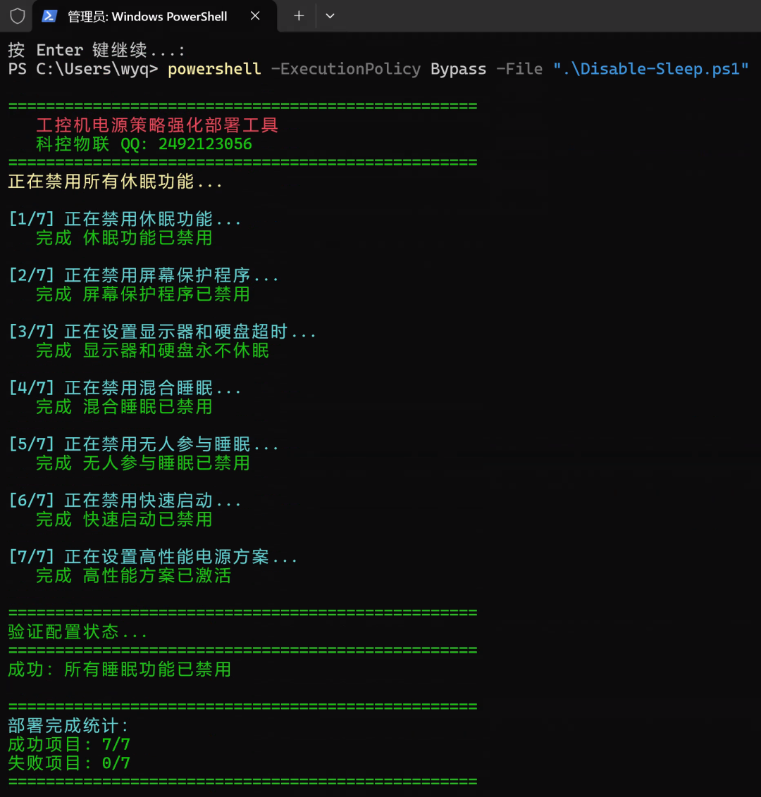 powershell -ExecutionPolicy Bypass -File ".\Disable-Sleep.ps1"运行脚本效果: