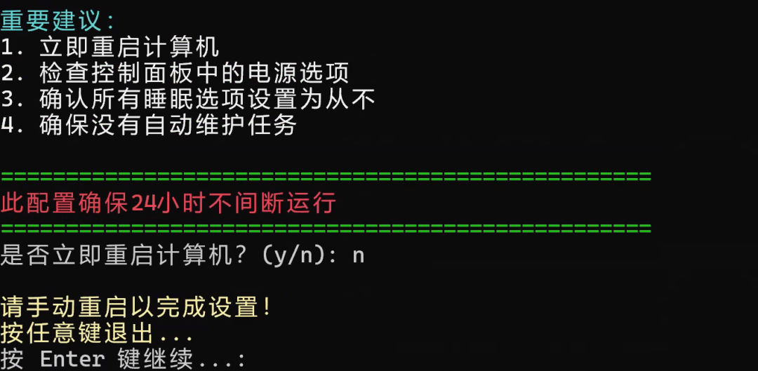 Write-Log "此配置确保24小时不间断运行" "INFO"