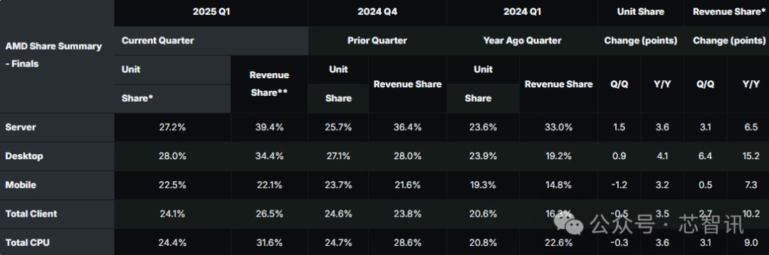 从2025年一季度AMD在各个CPU细分市场的份额来看: