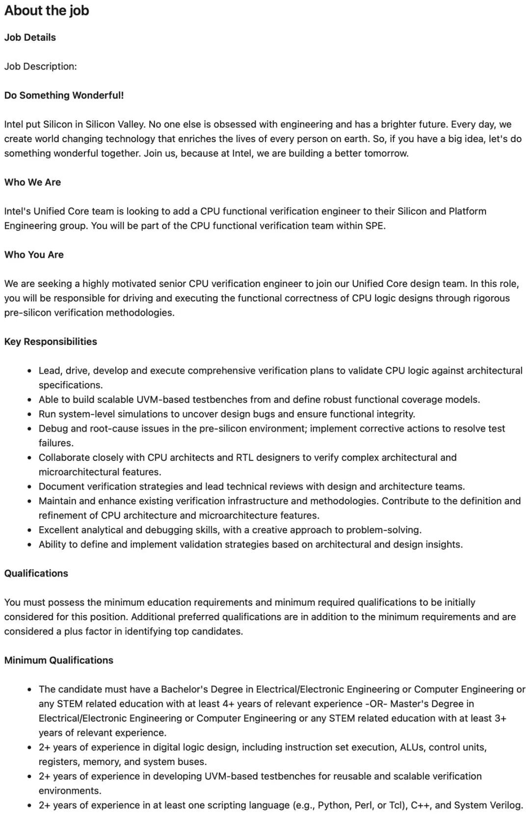 英特尔要求,该工程师职位需确保CPU逻辑设计的功能正确性,并使用严格的硅前(pre-silicon)验证流程,并与CPU架构师及RTL设计师紧密合作,以验证复杂的架构与微架构特性。同时,还需具备x86架构知识与经验、熟悉Synopsys模拟器以及组合语言技能。