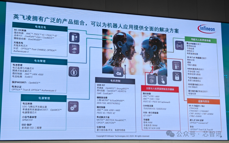 总结来说,在机器人领域,英飞凌提供了从“首”到“足”全方位赋能的全栈式解决方案,涵盖传感、连接、实时决策、人机交互等核心环节。通过利用传感器、MCU、功率器件等半导体产品,英飞凌赋予机器人精准的环境感知、实时决策和灵活运动能力,同时先进的电池管理解决方案则延长了机器人的续航时间,还能让马达驱动的系统尺寸变得更加小巧且减轻重量。英飞凌的创新技术助力机器人实现智能化、高效化和轻量化,推动其在工业、服务和其他场景的广泛应用。